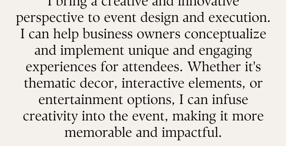 I bring a creative and innovative perspective to event design and execution. I can help business owners conceptualize and implement unique and engaging experiences for attendees. Whether it's thematic decor, interactive elements, or entertainment options, I can infuse creativity into the event, making it more memorable and impactful.